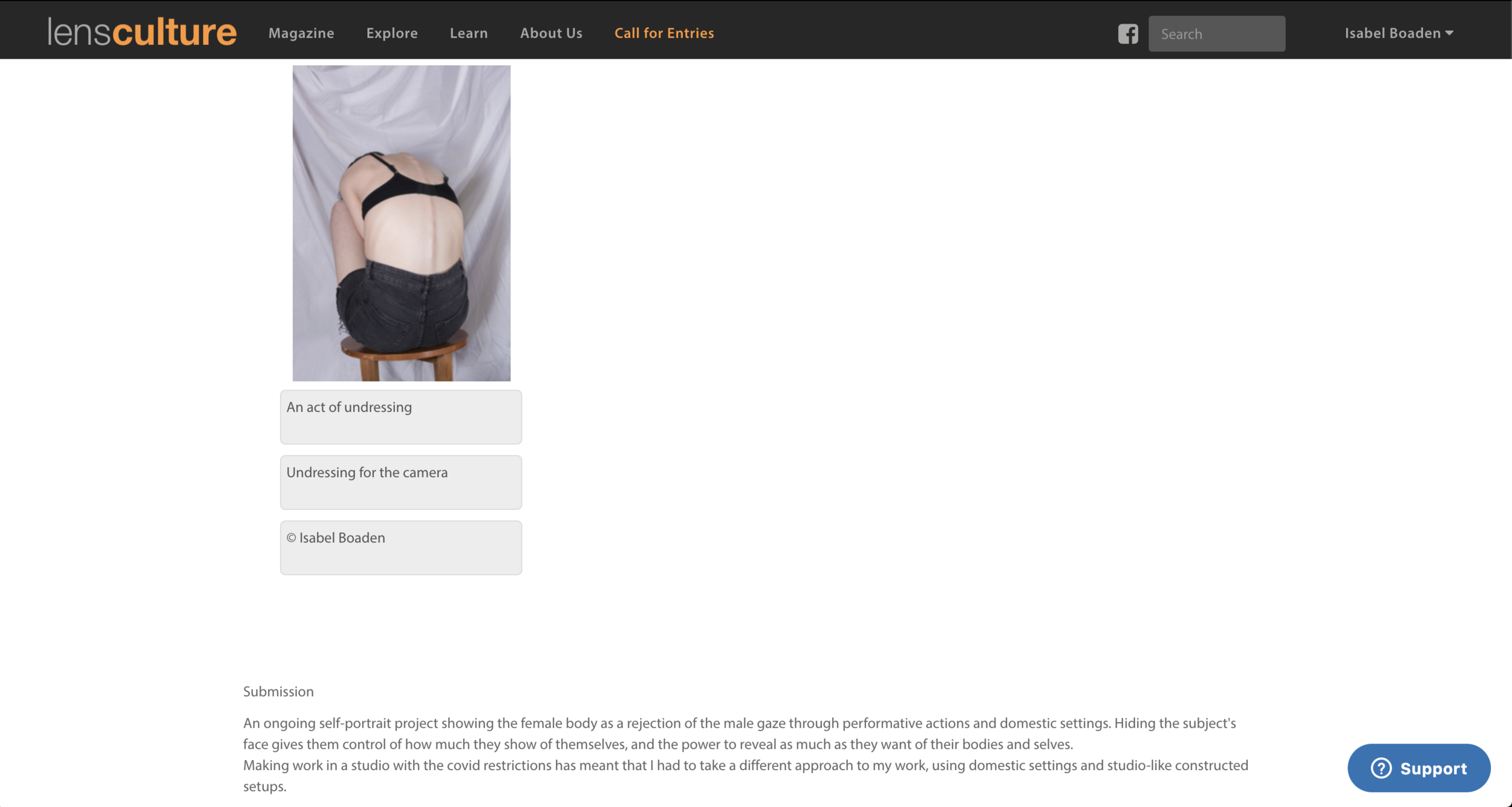 I decided to enter the LensCulture portrait awards. This is good practice to get my work seen and to network myself. I chose this single image category as I felt that this image is strong on its own to show the narrative. This project is still a work in progress and I have been struggling to work out I want to approach it however, I am still experimenting with different ideas to see which direction I want to go in.